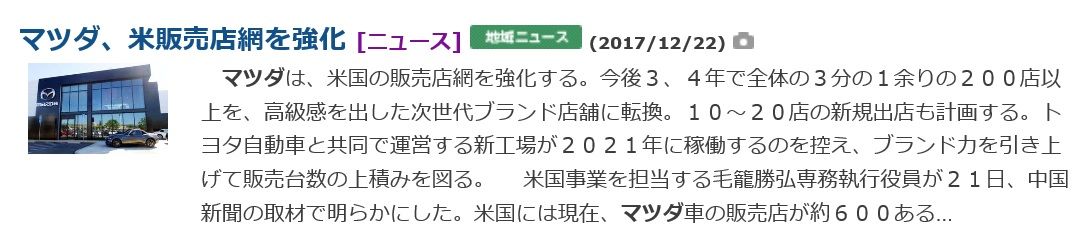マツダ 米販売店を大幅に増やす 2017/12/22 コラム スポンサーリンク 中国新聞 12月22日 http://www.chugoku-np.co.jp/ Source: 新車速報 Car Drive