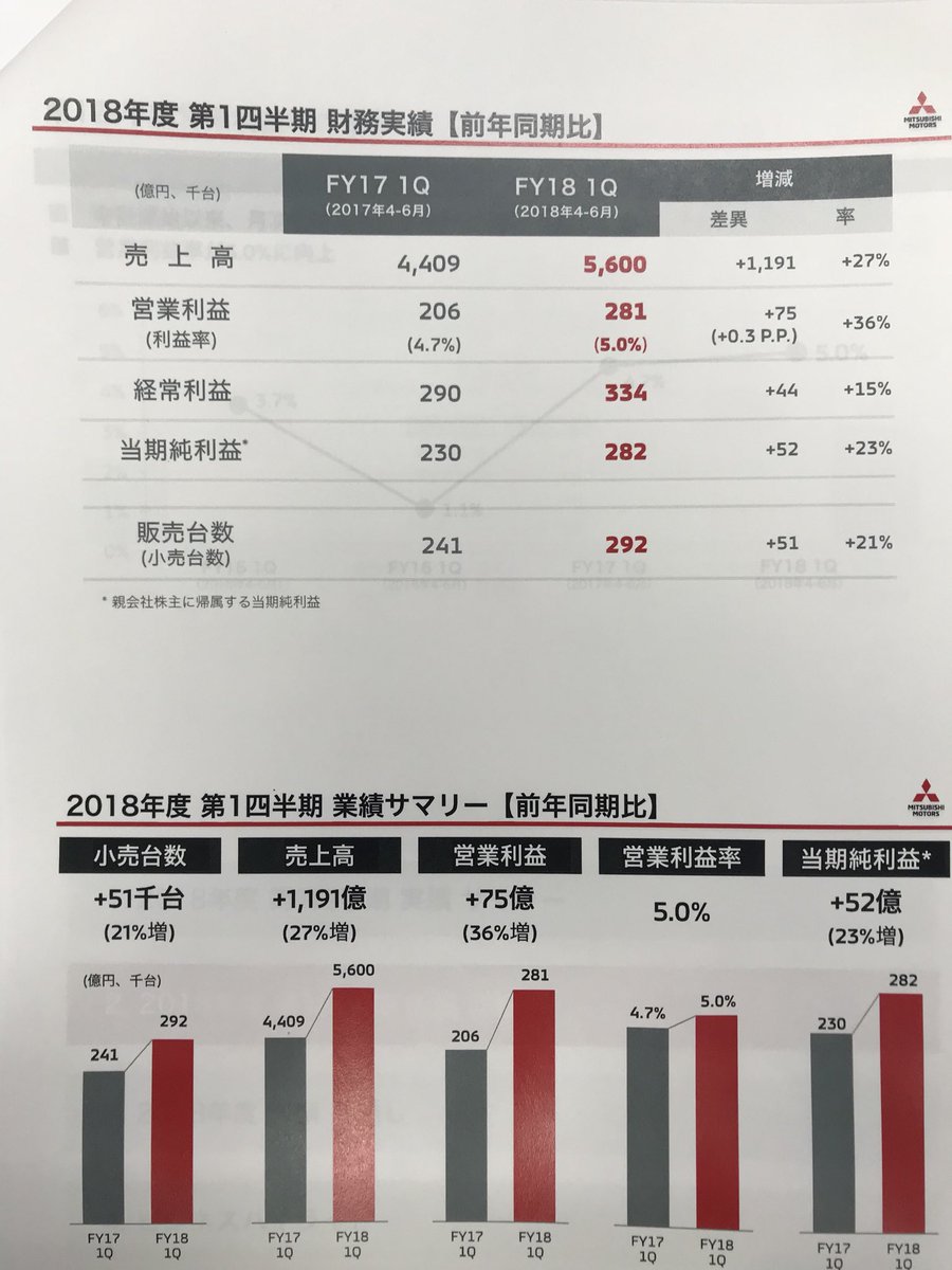 売上高は前年同期比27%増の5600億円、経常利益は前年同期比15%増の333億円、営業利益は前年同期比36.3%増の281億円だった。 グローバル販売台数は292千台となり、前年同期から21%増加した。 2019年3月期は純利益が前期比2.2%増の1100億円、売上高が前期比9.5%増の2兆4000億円、経常利益が前期比13.5%増の1250億円、営業利益が前期比12%増の1100億円の見通し。日本経済新聞