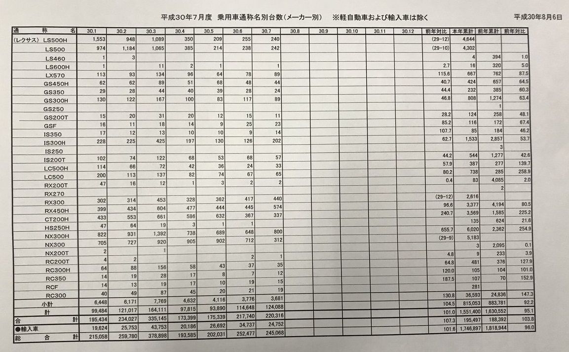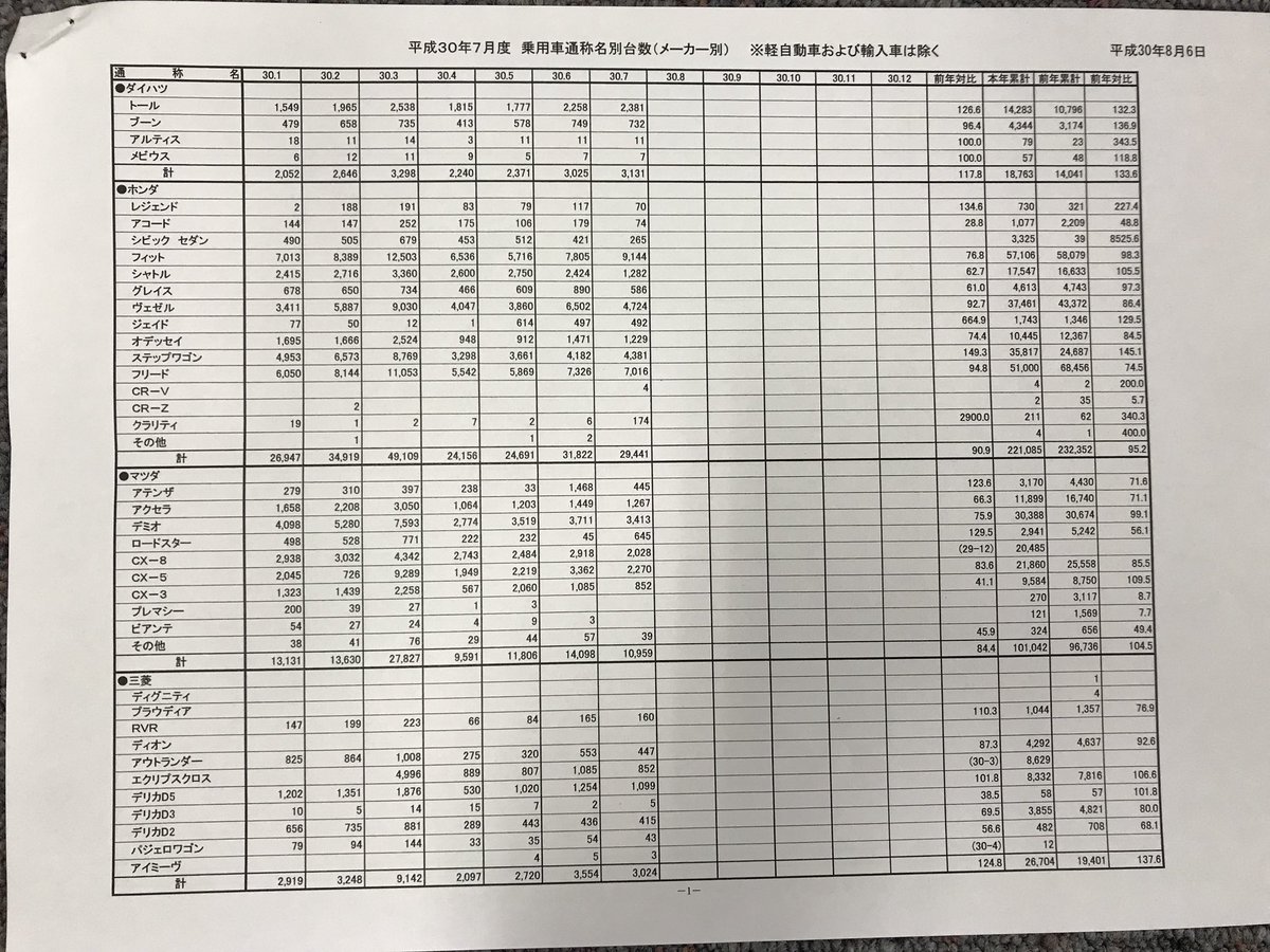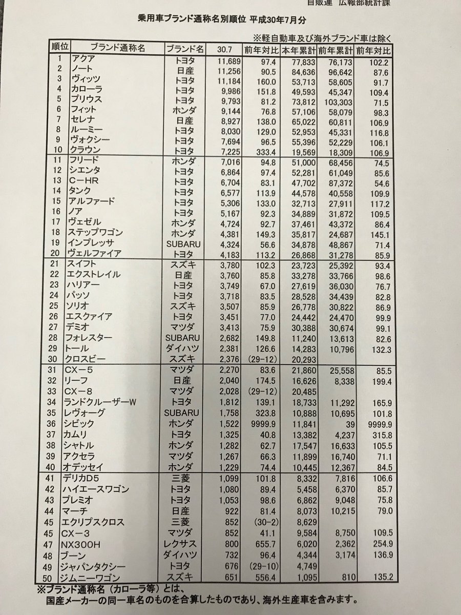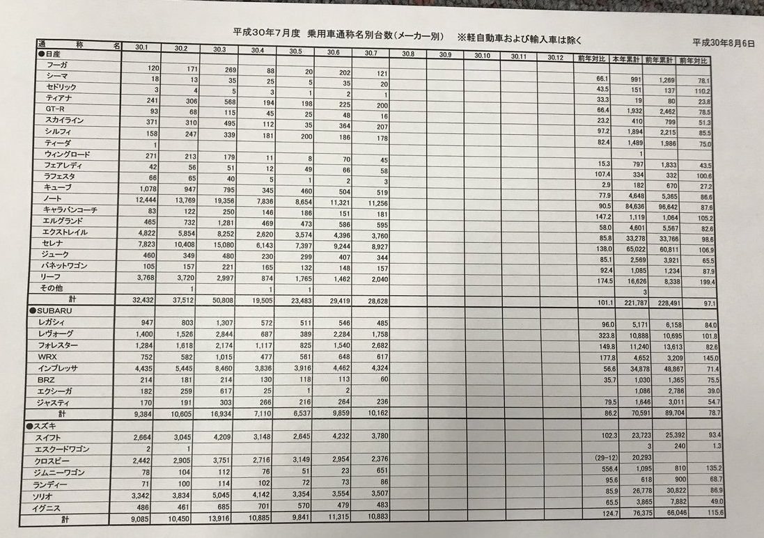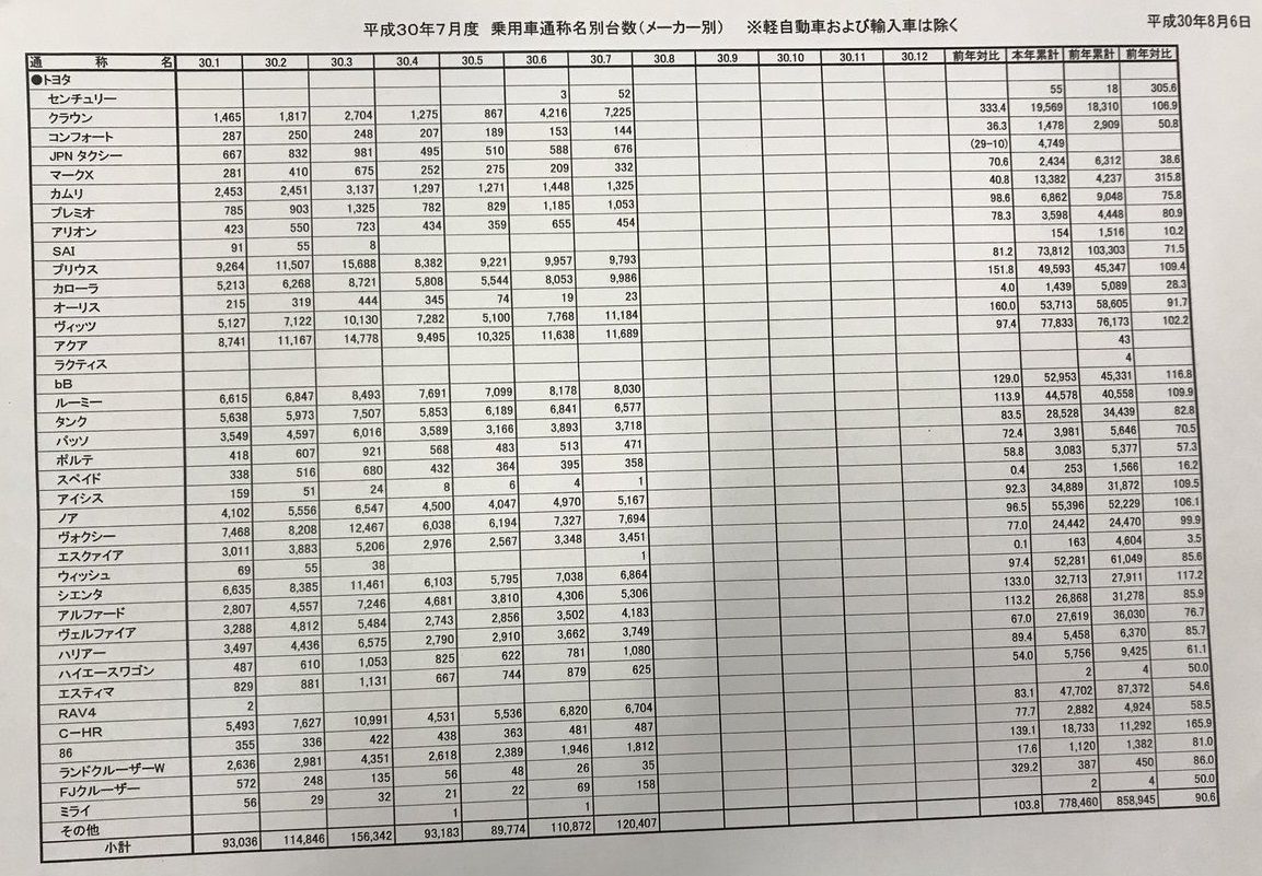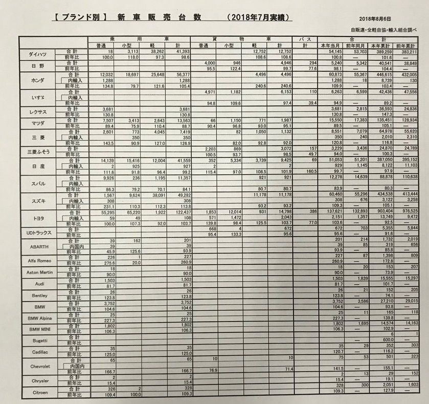 2018年7月国内車名別販売一覧表 2018/8/6 コラム スポンサーリンク マガジンXさんが今月も国内のメーカー・車名別販売状況一覧表をツィートしてくれました。https://twitter.com/CyberMagazineX Source: 新車速報 Car Drive