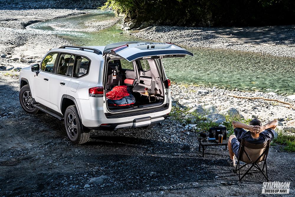 寝る時の頭の位置は後方へ、5人乗りの荷室は凹凸無し! クロカン4WDの絶対王者として、国内のみならず世界中でその名声が広く認知されているランドクルーザー。現在、70、250、そして300の3モデルをラインアップしており、フラッグシップモデルの位置付けとなる300は、派手な面構えや豪華装備の内装、さらには先進運転機能も充実している。全7グレード、5人乗りと7人乗りを設定しており、今回車中泊してきたのは5人乗りの「GRスポーツ」。 就寝スペースの確保は、前回の70と同じく、後席を座面ごと前倒しするだけで簡単に広々スペースを作ることができるので、これだけでOK。ただ後席をタンブルして格納した際の荷室長は70よりも広い1700m程度(70は1500mm)あるが、身長170cm以上の大人が寝るにはかなりギリギリ。自分が寝るには膝をちょっと曲げなければならず、少々窮屈な体勢になってしまった。寝れなくはないが、窮屈な体勢での睡眠は疲れが残ったり、身体のどこかが痛くなる原因になりかねないので、足をしっかり伸ばせるスペースを確保したい。色々な体勢を試してみたが、ランクル300の最適解は荷室スペースを斜め…