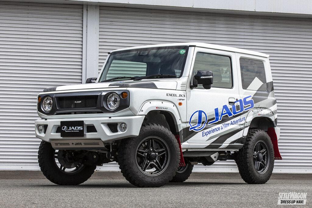 ジムニーが持つ走行性能を限界まで引き出すアイテム BAJA1000参戦マシンのカラーリングをモチーフとしたジャオスのJB64ジムニーは、まるで競技車両のような疾走感に包まれている。スソを大胆に切り上げたフロント&リアのスポーツカウルはJB64用の設定もあり、武骨なオフロードタイヤのアピールにもってこい。メッシュタイプのフロントグリルもスポーティなムードを高め、純正からのイメージチェンジに効果を発揮する。リアまわりを見ると凸凹したスペアタイヤ取り付け部をフラットにスムージングする、リアハッチパネルが目立つ。スペアタイヤ分の軽量化に加え、リアビューを軽やかに見せてくれる。未塗装とスパルタンなマットブラック塗装済み、素材自体にデザインを施して塗装が不要なカーボン調の3タイプを設定している。 タフなルックスと走行性能を徹底強化!! 外装のカスタマイズだけでなく、機能パーツも豊富に用意しているジャオス。まずジムニーカスタマイズのキモとなるリフトアップセットは、予算やアップ量、走行シーンに合わせて選べるほど充実している。デモカーに装着しているバトルズリフトアップセットは、キャスター角補整用ブッシュ…