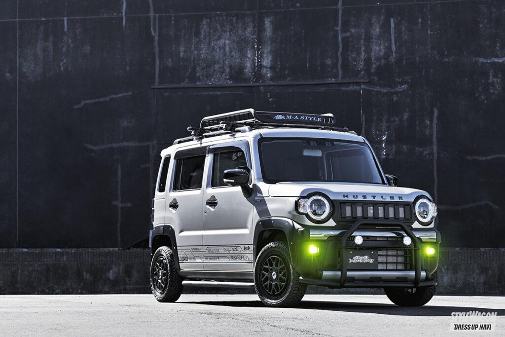 個性あふれるハスラーをより強靭なフォルムに! カスタマイズ界ではジムニーにスポットが当たりがちで、2代目ハスラー用パーツが少ないのが現状。しかしアヴァンツァーレのオフロードカスタムブランド、「4×4アヴァンツァーレ」は2代目ハスラーユーザーを全力でバックアップ。アグレッシブなフォルムに仕立てるアイテムを豊富に取り揃える。 フロントまわりは2種類のバンパーガードを設定。デモカーはパイプがグリル部分まで被るバージョン1を装着しており、別売のLEDワークライトを装着できる台座も付いている。またハスラーの新グレードとして設定された、タフワイルド専用フロントグリルをどこよりも早くリリース。ブラックアウトされたライト枠を生かすべく、グリル部分に被せる手法を採用。手軽にイメージチェンジを楽しめる。サイドビューはフロントと同じく極太のパイプで作られたサイドガードバー、出幅9mmのオーバーフェンダーでたくましさを注入。リアにもセンターガードバーを設定しており、トータルバランスを追求。視覚的に車幅をワイドに見せる、左右出しのエキゾーストリアマフラーとセットで装着したい。 SUZUKI HUSTLER4X4…