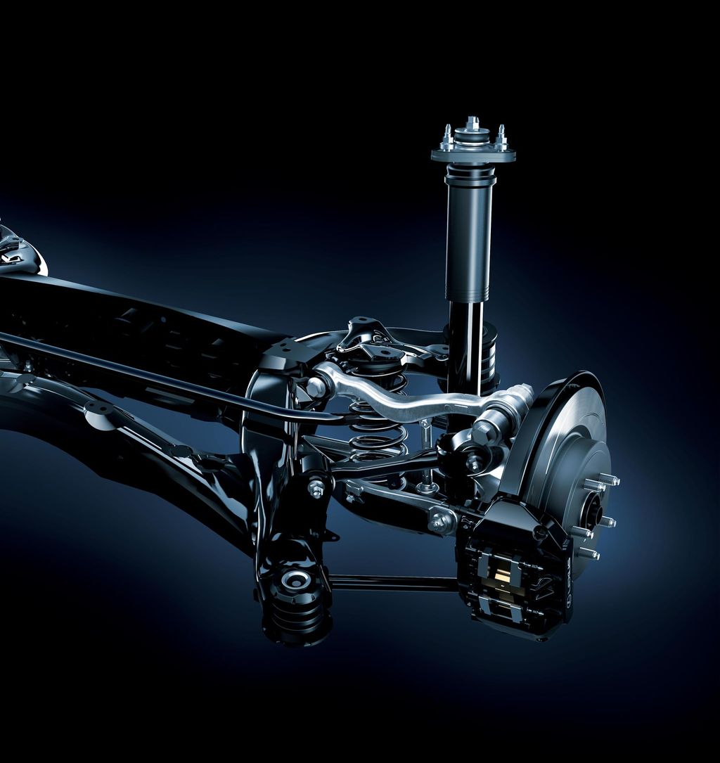 ただし、次期クラウンの車幅が1800mmと発表されていることと、ゴルフバッグ4個が収まるトランクスペースがマストであろうことを考えると、スプリングとダンパーがセパレートしていて、スペース的に有利なマルチリンク・サスペンション(レクサスRCなどに採用しているタイプ・下の画像)を採用するほうがいいのかも? と思ってみたり。そもそも、同じ世代のクルマでありますが、現行のレクサスGS、RCなどと現行クラウンのプラットフォームは一世代異なるはずで、レクサスのミドル級プラットフォームをクラウンに合わせて展開するだけでもいいのかもしません。ただ、TNGAプラットフォームと呼んでいることから考えると、それはちょっと考えづらいのでありますが……。