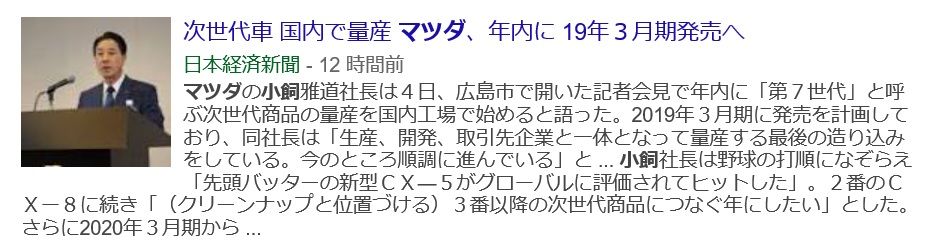 2019年3月期に発売を計画しており、同社長は「生産、開発、取引先企業と一体となって量産する最後の造り込みをしている。今のところ順調に進んでいる」と述べた。 同社は17年2月に多目的スポーツ車(SUV)の新型「CX―5」、12月に国内専用車として3列シートの「CX―8」を発売した。18年は先進安全技術を高めた商品改良車をアテンザなどで発売する計画。 小飼社長は野球の打順になぞらえ「先頭バッターの新型CX―5がグローバルに評価されてヒットした」。2番のCXー8に続き「(クリーンナップと位置づける)3番以降の次世代商品につなぐ年にしたい」とした。 日本経済新聞