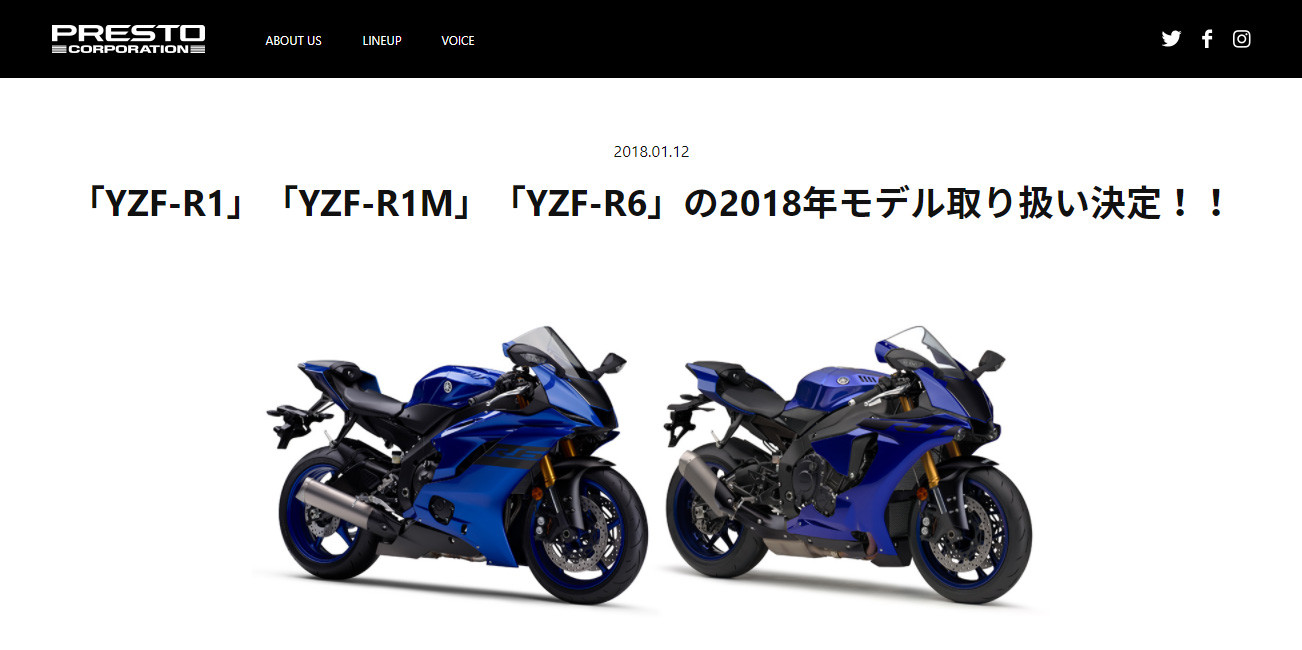 引用元:「YZF-R1」「YZF-R1M」「YZF-R6」の2018年モデル取り扱い決定!! | プレストコーポレーション