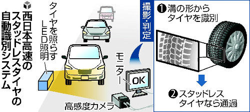 西日本高速道路は今冬、走行中の車のタイヤを高感度カメラで撮影し、スタッドレスタイヤかどうかを自動識別するシステムを全国で初めて導入する。