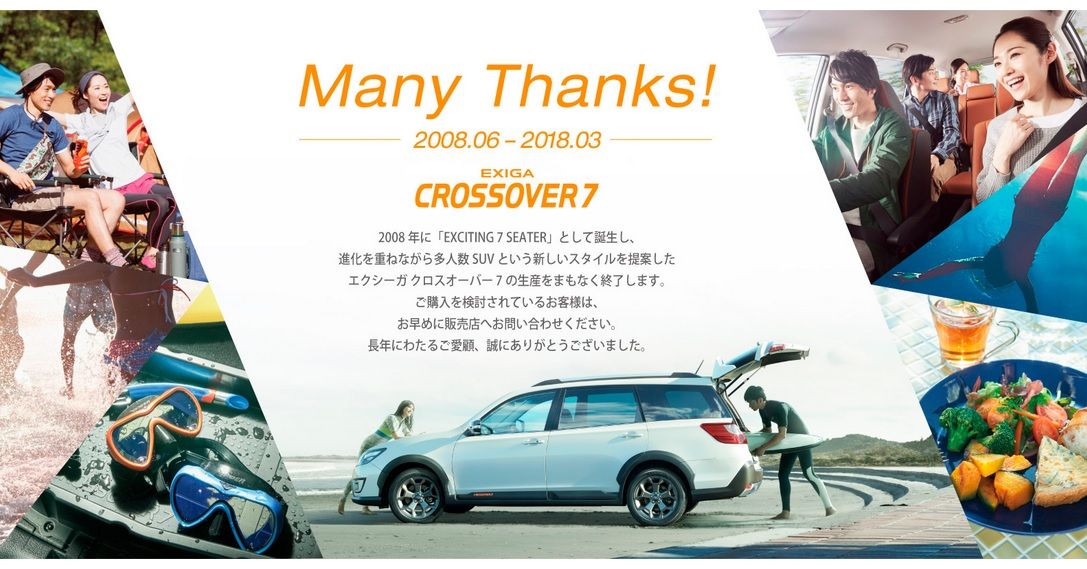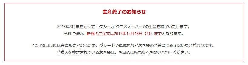 スバル エクシーガ 12月18日終了 2017/12/9 コラム スポンサーリンク スバルのサイトで エクシーガ が12月18日に注文受付終了とありました。https://www.subaru.jp/crossover7/ Source: 新車速報 Car Drive